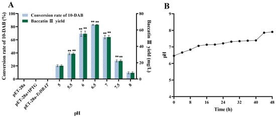 Effect of pH on the whole-cell catalytic process of baccatin III. (A) Effect of pH on the whole-cell catalytic synthesis of baccatin III. (B) Change of pH during biotransformation (initial pH = 6.5). ** represents significant differences at the p < 0.01 level.