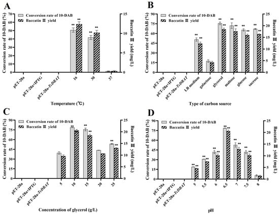 Process establishment for the whole-cell catalytic synthesis of baccatin III based on needles of Taxus chinensis. (A) Optimization of temperature on the synthesis of baccatin III. (B) Optimization of carbon source type on the synthesis of baccatin III. (C) Optimization of carbon source concentration on the synthesis of baccatin III. (D) Optimization of pH on the synthesis of baccatin III. ** represents significant differences at the p < 0.01 level.