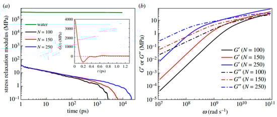 (a) Stress relaxation modulus G(t) for water and polymers with chain length N = 100, 150, and 250. The inset illustrates the same data for N = 100 short time-scale fluctuations at an early time arising from bond interactions. (b) Storage modulus G(ω) and loss modulus G(ω) for different chain length polymers calculated by Maxwell modes fit to the data of G(t). Solid and dash–dot lines denote the storage modulus and the loss modulus, respectively [23].