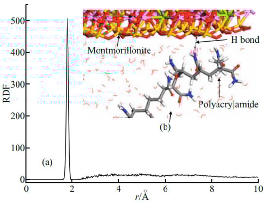 (a) Radial distribution function of the distance between hydrogen atoms of amide groups in polyacrylamide and oxygen atoms on the surface of montmorillonite clay layers. (b) The scheme of the H-bond interaction between the polyacrylamide and montmorillonite clay layer [27].