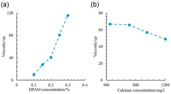 (a) HPAM concentration and (b) calcium concentration vs. measured apparent viscosity (all experiments in (a,b) were carried out under 333 K and 0.1 Mpa; the formation-water used in (a) was composed of 1.5 g/L sodium and 1.2 g/L calcium ions; HPAM and sodium concentrations of (b) are 0.2% and 1.5 g/L, respectively) [29].