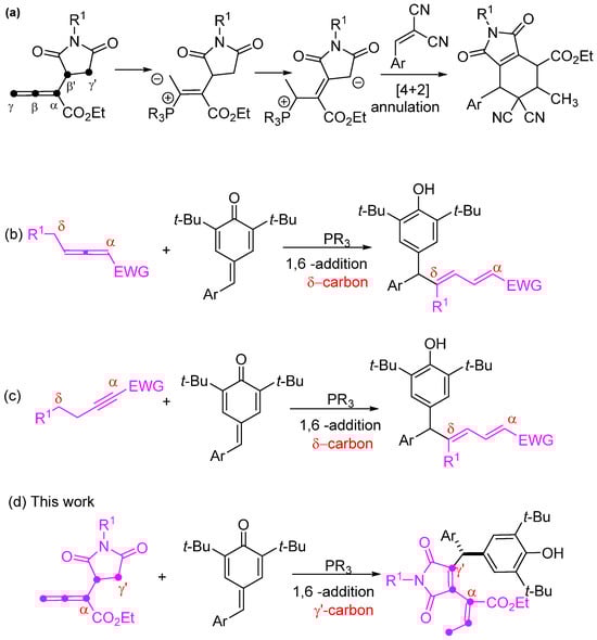 Over the past two decades, there has been a notable growth in phosphine catalysis within organic synthesis. This expansion is attributed to the versatile nature of phosphine, attracting attention from numerous research groups [1,2,3,4,5,6,7,8,9,10,11,12]. Since the pioneering work of Kwon’s group in 2003, where they introduced α-substituted allenoates for phosphine-catalyzed [4 + 2] annulation [13], the potential of these allenoates in phosphine catalysis has been extensively explored. While various electrophilic partners have been employed in phosphine-catalyzed nucleophilic additions or annulations with α-substituted allenoates [14,15,16,17,18,19,20,21,22,23,24,25,26,27,28,29,30,31,32,33], there remains value in investigating novel α-substituted allenoates with diverse structures. Such research endeavors hold promise for revealing new reaction pathways and enriching synthetic routes for a wide array of functional molecules. Very recently, our group was the first to report a series of new α-succinimide substituted allenoates, which can undergo a [4 + 2] annulation reaction with 1,1-dicyanoalkenes under phosphine catalysis, involving the γ′-carbon of the allenoates (Scheme 1a) [34]. But there have been very few works related to the γ′-carbon addition of allenoates under phosphine catalysis [35,36]. Therefore, the potential of α-succinimide substituted allenoates in nucleophilic phosphine catalysis remains underexplored. Therefore, continuous exploration of the addition reactions involving this allenoate is highly recommended.