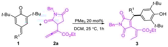 Heterocyclic diarylmethane molecules have exhibited a wide range of biological applications [51,52,53,54,55,56,57,58,59]. As part of our ongoing efforts to develop new methodologies for synthesizing functionalized organic compounds under phosphine catalysis, we introduce an innovative and highly regioselective synthesis of 4-diarylmethylated 3,4-disubstituted maleimides. Herein, we report the first example of a phosphine catalyzed γ′-carbon 1,6-addition of α-succinimide substituted allenoates to para-quinone methides (Scheme 1d).