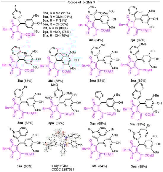 Following the determination of optimal conditions for 1,6-conjugate addition, we investigated the substrate scope of this reaction. In Scheme 1, we explored the influence of various functional groups on the benzene ring of p-QMs. Under the optimized conditions, it was observed that the p-QMs carrying various electronically diverse functional groups at the para-position of the phenyl ring facilitated the formation of conjugate adducts with yields ranging from good to excellent. Smooth conjugate addition was achieved with electron-rich methyl- and methoxy-substituted aryl quinone methides, resulting in excellent yields of the adducts (Scheme 2, 3ba, 3ca). Similarly, the reactions effectively yielded the corresponding products in good yields (Scheme 2, 3da–3ha) when employing arenes containing electron-deficient functional groups such as halogens, nitro groups, and cyano groups. Additionally, satisfactory performance was demonstrated in the reaction with p-QMs containing an ortho-substituted aryl moiety (Scheme 2, 3ia–3la). The applicability of the reaction was expanded to include meta-substituted aryl quinone methides (Scheme 2, 3ma–3oa). Furthermore, trisubstituted aryl quinone methides were investigated, and the conjugate addition yielded the desired in good yields (Scheme 2, 3pa). Moreover, the reaction was employed with p-QMs derived from β-naphthaldehyde, resulting in enhanced product yields (Scheme 2, 3ra). The reaction also showed success with the p-QM substrates generated from thiophene-2-carboxaldehyde and indole-3-carboxaldehyde (Scheme 2, 3qa, 3sa–3ua). The structure of 3sa was confirmed via X-ray analysis (CCDC 2287621) [60]. These data are accessible free of charge from the Cambridge Crystallographic Data Centre via http://www.ccdc.cam.ac.uk/data_request/cif. 9 August 2023. (DOI: 10.5517/ccdc.csd.cc2gsg7z). For further details regarding the crystal structure of 3sa, please refer to the Supplementary Materials.