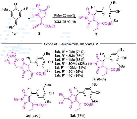 In addition to p-QMs, we explored the substrate scope of α-succinimide allenoates with various R2 groups using 1a as the coupling partner (Scheme 3). We were pleased to observe that the reactivity of the substrates remained unaffected when electron-donating substituents were introduced into the benzyl phenyl ring, resulting in yields of 74–81% (Scheme 3, 3ab–3af). However, the yields slightly decreased to 55% and 34% for 3ag and 3ah, respectively, when R’ groups with electron-withdrawing properties were employed. Encouragingly, the reaction displayed good tolerance toward the phenyl group, as evidenced by the successful formation of the corresponding products in 84% yield (Scheme 3, 3ai). Additionally, when R2 was a methyl group or a diphenyl-substituted methyl group, the products were obtained with respective yields of 74% (Scheme 2, 3aj) and 57% (Scheme 3, 3ak).