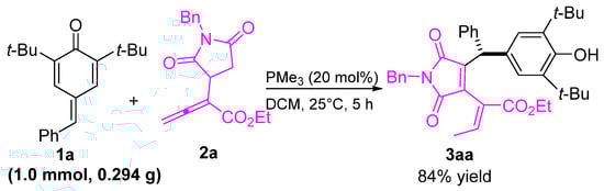 This investigation commenced by examining the reaction between α-succinimide allenoate 2a and para-quinone methide (p-QM) 1a. A catalyst, MePPh2, was employed at 20 mol % with DCM as the solvent. The desired product 3aa was obtained with a yield of 34% (Table 1, entry 1). Various phosphines were also tested for the cascade remote 1, 6-addition reactions. However, no enhancement in reactivity was observed with the phosphines EtPPh2 and PrPPh2 (Table 1, entries 2, 3). Fortunately, when the reaction was attempted with Me2PPh and PMe3, smooth conversion was achieved, yielding the 1,6-conjugate addition product 3aa with yields of 67% and 92%, respectively (Table 1, entries 4, 5). It is noteworthy that the presence of PCy3 or PBu3, with their bulky substitution groups, resulted in decreased yields (Table 1, entries 6, 7). Considering the optimal catalyst, PMe3, we further optimized the reactions, using different solvents. Solvent screening revealed that DCE yielded similar results to DCM (Table 1, entry 8), while toluene, THF, and EtOAc exhibited low reactivity as solvents (Table 1, entries 9–11). Conversely, CH3CN and CH3OH resulted in inferior outcomes (Table 1, entries 12, 13). By reducing the loading of PMe3 to 10 mol % and 5 mol %, the yields of 3aa decreased to 85% and 75%, respectively (Table 1, entries 14, 15). Therefore, the optimal reaction conditions were determined to be DCM as the solvent, room temperature, and 20 mol% of PMe3 as the catalyst.