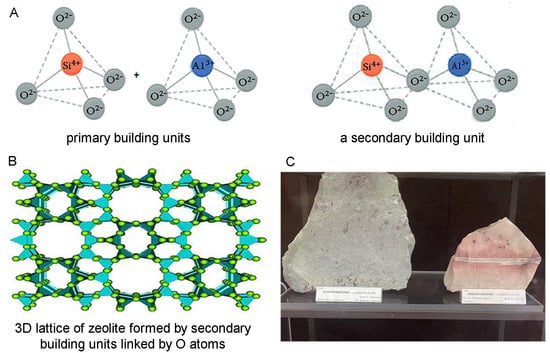 Structure of zeolites. (A) Primary and secondary building units of zeolite. The primary building units represent tetrahedral structures with mostly Si or Al in the center of the tetrahedron and O atoms at the corners (left), which are shown to be linking the tetrahedrons in the secondary units (right). (B) Secondary building units further linked by O atoms and forming a complex three-dimensional lattice underlying the microporous structure of zeolite holding cavities filled with water molecules and ions (by Derbe et al. [52]). (C) Clinoptilolites from the region of Kardzhali, Rhodope mountain, South Bulgaria (collection of the Museum “Earth and People”, Sofia, Bulgaria).