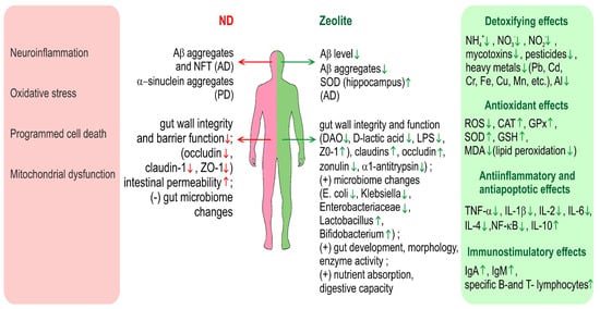 Overview on the various effects of zeolite in relation to neurodegenerative diseases and especially AD and PD. Green arrows denote positive effects and red arrows-negative. ND—neurodegenerative diseases, DAO—diamine oxidase, ZO-1—Zonula occludens-1.