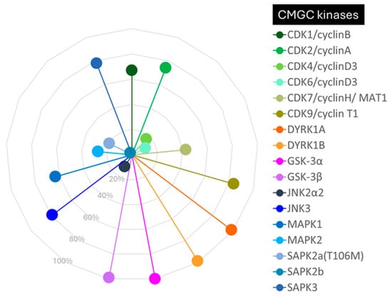 Figure 3. Selectivity of compound 62 against a panel of selected CMGC kinases (CDK1, CDK2, CDK4, CDK6, CDK7, CDK9, DYRK1A, DYRK1B, GSK-3α, GSK-3β, JNK2α2, JNK3, MAPK1, MAPK2, SAPK2a, SAPK2b, and SAPK3). The data are presented as the percentage of kinase inhibition at a concentration of 1 μM of inhibitor 62.