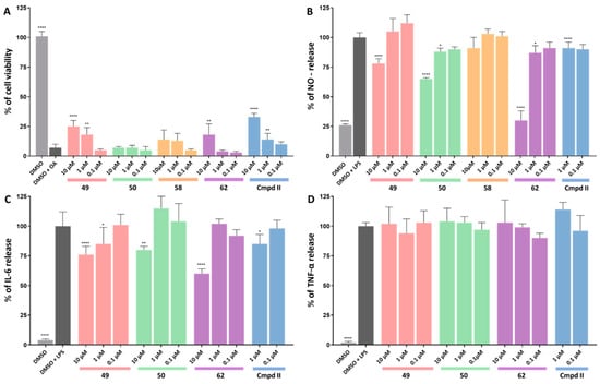 Lipopolysaccharide (LPS) is a potent pro-inflammatory stimulus triggering the extensive production of inflammatory mediators, including cytokines and chemokines. Consequently, it finds widespread application in inducing in vitro and in vivo models of sepsis and inflammation, including neuroinflammation. In this study, we employed LPS in the BV-2 cell line and assessed the impact of the selected compounds on the levels of NO, IL-6, and TNF-α production (Figure 4B–D). At a concentration of 10 µM, compounds 49, 50, and 62 significantly decreased NO and IL-6 levels. Notably, at 1 µM, compounds 50 and 62 reduced NO levels, while compound 49 reduced IL-6 levels. Moreover, all compounds surpassed the reference compound in these assays. Similar to II, none of the compounds exhibited a decrease in TNF-α levels in the assay.