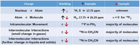 As seen in Figure 1, the magnetic properties of atoms and molecules are the function of their electronic structures. Atoms are usually more shielded, having more electrons, but atomic electronegativity is also an important feature. Molecules have a more complex distribution of electrons around atomic nuclei, and all the terms of Equation (2) must be remembered. The total shielding can be negative for some atomic nuclei; the F2 molecule is a spectacular example of such a case but is not unique. There are many other examples of the total deshielding effects for diamagnetic molecules, especially observed in 15N, 17O, and 19F NMR spectra. However, more electrons in the neighborhood usually lead to an increase in nuclear magnetic shielding in diamagnetic molecules. Molecular vibrations and rotation cause further changes in shielding because the interatomic distance is enlarged. It results in deshielding effects in the majority of molecules, but some exceptions from the above rule are also known, cf. PH3 molecule shown in Figure 1. All intermolecular interactions also modify nuclear shielding in diamagnetic molecules; usually, the decrease of shielding is observed, but the reverse effects occur for selected atoms containing lone pairs of electrons. Figure 1 illustrates such a case for a 15N nucleus in acetonitrile.