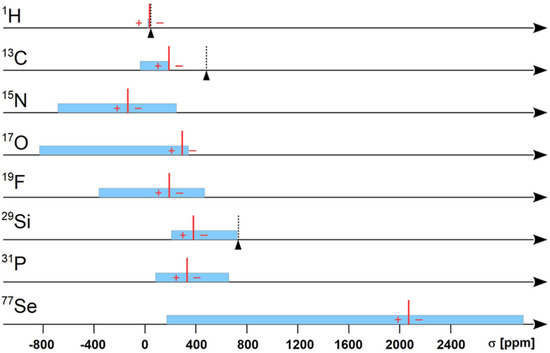 On the scale of nuclear magnetic shielding, the blue bars represent the range of chemical shifts for selected nuclei [43]. The values of chemical shifts can be positive (+) or negative (−) depending on the position of the reference standard (I). Special shielding effects are also highlighted by black triangles for three compounds containing iodide atoms: HI in 1H, CI4 in 13C, and SiI4 in 29Si NMR [35,44,45,46,47].
