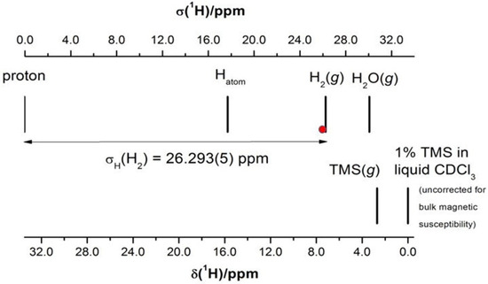 Alternative reference standards of shielding and chemical shifts for 1H NMR: the red dot (•) represents the shielding of liquid water in a spherical sample at 34.7 °C σref(H2Oliq.sph) = 25.790(14) ppm [77], σ0(H2) = 26.293(5) ppm [35], σ0(H2O) = 30.102(8) ppm [29], and σ0(TMS) = 30.783(5) ppm [25]; σ(1% TMS in liq. CDCl3) = 33.480(5) ppm as shown in Table 1.