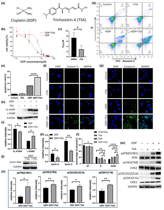Effect of trichostatin A (TSA) on the cytotoxicity of cisplatin (DDP). (a) Structure of DDP and TSA. (b,c) IC50 curves (b) and IC50 values (c) of DDP for A549 cells in the presence (black line) or absence (red line) of TSA (1 μM) (n = 3). (d) Apoptosis assays for A549 cells exposed to A549 cells treated with cisplatin (8 μM), TSA (1 μM), or both DDP and TSA. (e) Percentage of late stage of apoptotic A549 cells treated under different conditions (n = 3). (f,g) Immunofluorescence images showing the expression level of cleaved-caspase 3 (f) and cleaved-caspase 6 (g) in A549 cells treated under different conditions. (h) Western blotting data showing the changes in the level of full-length (FL-) and cleaved (c-)PARP in A549 cells treated under different conditions. GAPDH was used as an internal reference. (i) Relative abundance to GAPDH of FL-PARP/c-PARP measured by Western blot assay (n = 3). (j) Western blotting data showing the changes in the level of lamin A&C in A549 cells treated under different conditions. GAPDH was used as an internal reference. (k) Relative abundance to GAPDH of lamin A&C measured by Western blot assay (n = 3). (l) Histograms of population distribution at different cell cycles of A549 cells treated under different conditions (n = 3). (m,n) Western blotting data showing the changes in the level of phosphorylated proteins involved in the ATM-CHK2-CDC25C-CDK1 pathway. GAPDH was used as an internal reference to calculate the relative abundance of the phosphorylated proteins (n = 3). In the panels (c,e,i–k,m), the data are presented as means ± SD; * p < 0.05, ** p < 0.01, *** p < 0.001, and **** p < 0.0001 (Student’s t test).