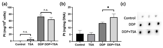 After treatment with TSA (1 µM) and/or DDP (8 µM) for 48 h, cells were individually collected for each group, counted by the LUNA-II™ Automated Cell Counter (Logos Biosystems, Solana Beach, CA, USA), and digested by 20% HNO3 at 200 °C. Finally, the residue was re-dissolved in 1% HNO3, and ICP-MS (Agilent 7700, Santa Clara, CA, USA) was used to determine the concentration of Pt in the cells. In order to measure the concentration of DNA-bound platinum, nuclear DNA in each group of cells was extracted using the Nuclear Extraction Kit (BestBio, Shanghai, China) and Genomic DNA Mini Preparation Kit with Spin Column (Beyotime). The concentration of DNA in each extract was detected by NanoDrop (ThermoFisher Scientific) before the concentration of Pt was determined by ICP-MS. The measurements for Pt concentration in whole cells and bound with DNA were repeated three times independently, and the values were represented as the amount of Pt (ng) per 106 cells or Pt (ng) per mg DNA.