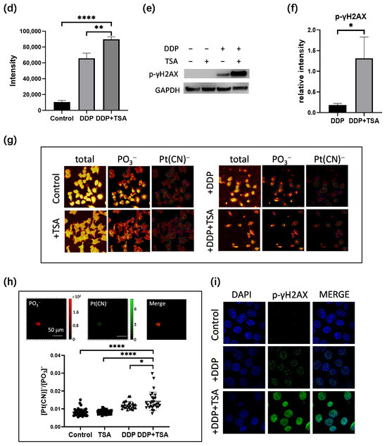 It is well recognized that cisplatin exerts cytotoxicity by attacking DNA to cause lesions on genomic DNA [1,2,5]. To further verify whether TSA promoted the cytotoxicity of cisplatin by enhancing cisplatin-induced DNA lesions, we employed ICP-MS, ToF-SIMS, and immunofluorescence imaging to determine the platinum level on a large scale of cells and in single cells, respectively. Firstly, we cultured A549 cells with 8 μM of cisplatin for 48 h in the absence and presence of TSA (1 μM), respectively. Then, we harvested the cells and measured the cellular accumulated Pt and DNA-bound Pt by ICP-MS. The results showed that TSA did not pronouncedly change the cellular uptake of cisplatin, presented as nanograms of Pt per million cells (Figure 2a), but significantly increased the amount of cisplatin binding to DNA (Figure 2b), which was evidenced by the dot blotting assay (Figure 2c,d), where the cisplatin-crosslinked DNA was stained by a specific antibody of platinated DNA [24]. Moreover, we found that the expression level of phosphorylated γH2AX, which is a well-known biomarker of DNA damage caused by genotoxic drugs like cisplatin [16], significantly increased in the cells treated with DDP and TSA in comparison with the cells treated with cisplatin alone (Figure 2e,f), also evidencing the elevation of cisplatin-bound DNA due to TSA co-administration.
