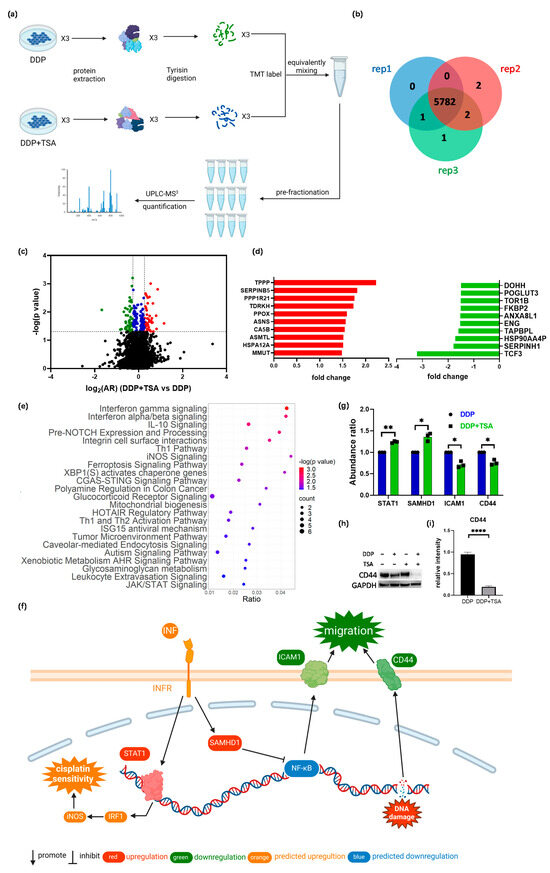 MS-based quantitative proteomics identified differentially expressed proteins. (a) Workflow of quantitative proteomics analysis. (b,c) Venn diagram (b) and volcanic map (c) of proteins identified in A549 cells treated with 8 μM DDP in the presence or absence of 1 μM TSA for 48 h. In the volcanic map (c), black points refer to proteins with a p-value of > 0.05 (i.e., −lg p < 1.3), while red, blue, and green points refer to proteins with a p-value ≤ 0.05 and a log2(FC) (DDP + TSA vs. DDP) of ≥ 0.26 (red points), a log2(AR) of <0.26 and >−0.26 (blue points), or a log2(AR) of ≤−0.26 (green points). (d) Top 10 upregulated (red) and downregulated (green) proteins identified in the cells treated with DDP and TSA compared with those in the cells treated with DDP alone. (e) IPA enriched canonical signaling pathways with which all differentially expressed proteins (DEPs) with |FC| > 1.2 identified in A549 cells treated with DDP and TSA, compared with the proteins expressed in A549 cells treated with DDP only, are associated. (f) Diagrammatic representation of interferon-gamma (INF-γ) signaling pathway. (g) Histogram of the abundance ratio of selected DEPs expressed in A549 cells treated with DDP and TSA compared with the abundance of the same proteins expressed in the cells treated with DDP only. (h,i) Western blotting data showing the changes in the level of CD44 expressed in A549 cells treated under different conditions. GAPDH was used as an internal reference to calculate the relative abundance of CD44 (n = 3). The data in (g,i) are presented as means ± SD; * p < 0.05, ** p < 0.01, and **** p < 0.0001 (Student’s t test).