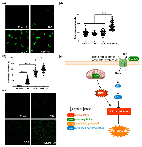 TSA enhances ferroptosis induced by cisplatin. (a) Fluorescence images of ROS probe DCFH-DA showing the ROS level of A549 cells treated with DDP (8 μM), TSA (1 μM), or DDP (8 μM) and TSA (1 μM) for 48 h. (b) ROS level in A549 cells measured by the fluorescence intensity of randomly selected single cells shown in (a). (c) Fluorescence images of liperfluo probe showing the level of lipid peroxidation in A549 cells treated under different conditions. (d) Lipid peroxidation level in A549 cells measured by the fluorescence intensity of randomly selected single cells shown in (c). (e) Diagrammatic presentation of ferroptosis pathway induced by SLC3A2 and TFAM. In panels (b,c), the data are presented as means ± SD; and **** p < 0.0001 (Student’s t test).