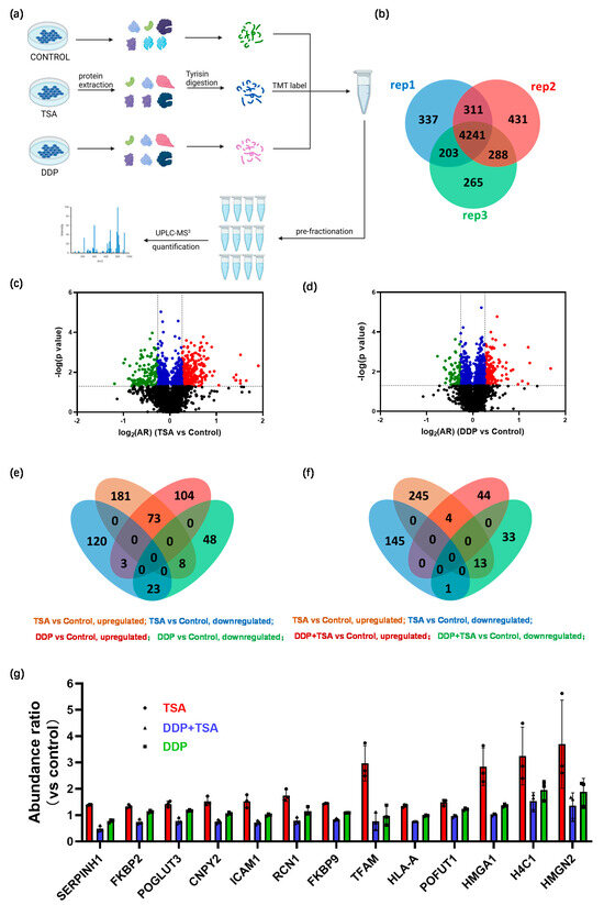 MS-based quantitative proteomics identified differentially expressed proteins. (a) Workflow of quantitative proteomics analysis. (b–d) Venn diagram (b) and volcanic maps (c,d) of proteins identified in A549 cells treated with 1 μM TSA only (c) or 8 μM DDP only (d) for 48 h. The Venn diagram shows 4241 proteins commonly expressed in three replicated experiments of the two groups of cells. In the volcanic maps, black points refer to proteins with a p-value of >0.05 (i.e., −lg p < 1.3), while red, blue, and green points refer to proteins with a p-value ≤ 0.05 and a log2(AR) (TSA or DDP vs. control) of ≥0.26 (red points), a log2(AR) of <0.26 and >−0.26 (blue points), or a log2(AR) of ≤−0.26 (green points). (e) Venn diagram showing differentially expressed proteins (DEPs) with a p ≤ 0.05 and a log2(AR) (TSA vs. control or DDP vs. control) of ≥ 0.26 or a log2(AR) of <−0.26, shown in (c). (f) Venn diagram showing DEPs with a p ≤ 0.05 and a log2(AR) (DDP + TSA vs. DDP) of ≥0.26 or a log2(AR) of <−0.26, shown in (d). (g) Histogram of the abundance ratio of selected DEPs expressed in A549 cells treated under different conditions. The abundance of the selected proteins was normalized to that of each selected protein expressed in the control group.