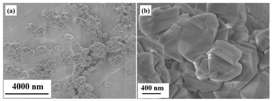 SEM images of the porous silico-aluminate nanoparticles under different magnifications: (a) 2000×; (b) 30,000×.