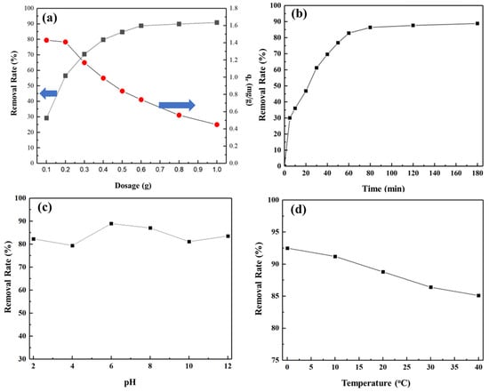 (a) Influence of the dosage of porous silico-aluminate nanoparticles on the removal rate of toluene; Effect of (b) capture time, (c) pH, and (d) temperature on the removal efficiency of toluene.