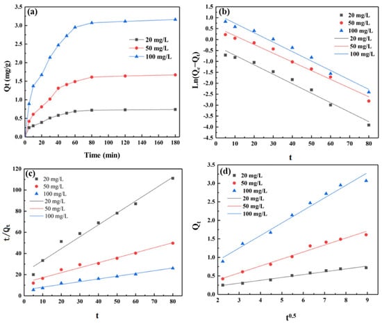 (a) Adsorption kinetics of different initial concentrations of toluene by porous silico-aluminate nanoparticles; The fitting results of the (b) pseudo-first-order, (c) pseudo-second-order and (d) Weber–Morris kinetics model for the absorption of toluene on porous silico-aluminate nanoparticles.