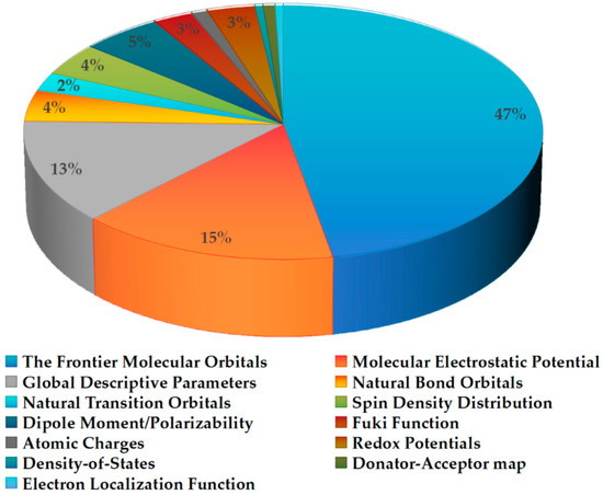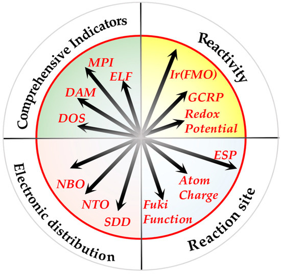 | Chemical potential (μ) | −μ = (IP + EA)/2 | μ indicates the direction of charge flow. Electrons will migrate from high μ to low μ locations [109,110]. |