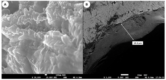 Scanning electron microscopy of the PDMS homemade needle; (A) internal surface of the PDMS layer; (B) thickness of the PDMS layer.