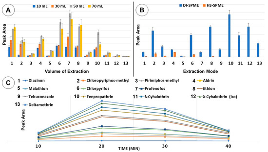 Optimization of SPME extraction: effect of (A) volume of extraction; (B) extraction mode; (C) time of extraction. The peak area is given as a relative value for each pesticide, with the corresponding standard deviation.