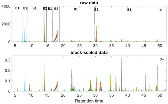 The present study aimed to chemically characterize the aroma of vinegar samples coming from batteries consisting of single-wood barrels and to examine any potential influences of the wood used on the final aroma of ABTM. To achieve this goal, the entire chromatographic signal of each sample was considered a “signature” capable of characterizing its properties. All chromatograms were pretreated as explained in Section 3.4 and analyzed by means of Principal Component Analysis. Briefly, the chromatographic region was divided into two blocks (B1 and B2, Figure 1a) and the data were block-scaled and mean-centered. As explained, the data underwent block-scaling, to ensure uniformity among selected blocks, and a column mean-centering. The chromatograms, before and after the pretreatment procedure, with corresponding division into blocks, are reported in Figure 1.