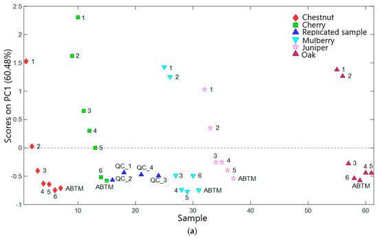 Five principal components (PCs) were utilized to develop the PCA model, explaining around 90% of the total variance (R2). Figure 2 displays the score and loading plots of the first principal component, PC1. Samples are represented by distinct symbols and colors corresponding to their batteries of origin. To facilitate reading and interpretation of the results, the replicate sample is labeled as “QC” followed by a number. As for the other vinegar samples, the labels refer to the barrel to which they belong (Table 1). For clarity, label 1 designates the samples from barrel 1 (the youngest samples, in terms of time in the barrel, within their battery) and label 6 the samples corresponding to barrel 6 (the oldest sample in terms of time in the barrel, within their battery). The ABTM label designates the marketable product aged at least 12 years.