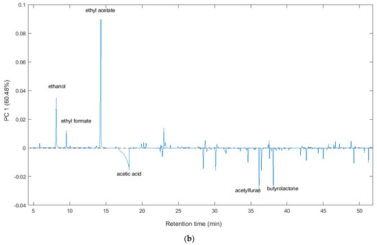 It is noteworthy that samples with a lower degree of aging, characterized by positive PC1 values, exhibited higher concentrations of ethanol (Rt: 7.957 min), ethyl acetate (Rt: 14.384 min), and ethyl formate (Rt: 9.548 min), as indicated by positive loadings of PC1. Significantly, as the product aged, the concentration of ethanol notably decreased. Samples showing a higher degree of aging, indicated by negative PC1 values, were mainly distinguished by an increased presence of furan compounds and other compounds with higher molecular weights. These results confirm earlier research [5], providing additional evidence for the significance of chemical constituents in distinguishing vinegar samples based on their aging process. These constituents include varying levels of acetic acid, ethyl acetate, and ethanol—key products of alcoholic fermentation and bio-oxidation—as well as furfurals and other minor compounds.