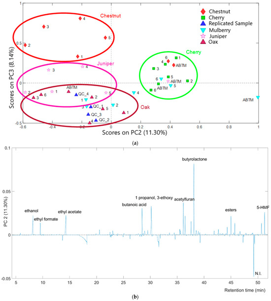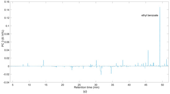The combined analysis of the PC2 and PC3 scores plot with the respective loadings plot (Figure 3b,c) allowed samples to be differentiated based on the presence and abundance of specific volatile compounds. Samples from batteries with cherry barrels appear enriched in high molecular weight compounds, such as esters (Rt from 40 to 46 min), butyrolactone, and furan compounds (Rt: 35.277 min, 38.802 min, and 30.559 min), most with PC2 positive loadings values (Figure 3b). Oak samples present an opposite trend compared to the aforementioned samples. They likely have a lower abundance of high molecular weight compounds and potentially lower content of ethyl benzoate (positive PC3 loading value, Figure 3c) On the other side, chestnut samples might have a higher content of the latter compound; this finding is supported by the results of earlier work [25] in which the same compound, which confers a distinct fruity and floral odor, was found as a characteristic analyte in a traditional fermented glutinous rice drink supplemented with chestnuts.