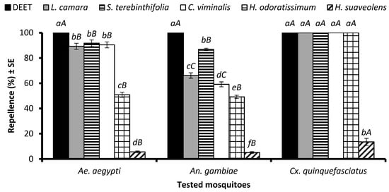 Repellency of positive control DEET and EOs at 33.3 µg/cm2 against Aedes aegypti, Anopheles gambiae s. l., and Culex quinquefasciatus mosquito females. Lowercase letters above the columns represent significant differences (p < 0.05) among tested EOs against particular mosquito species, while uppercase letters represent the significant difference (p < 0.05) among mosquitoes towards a particular EO, according to the ANOVA post-hoc Tukey test for each mosquito species and each EO separately. Error bars represent the standard error (n = 5).
