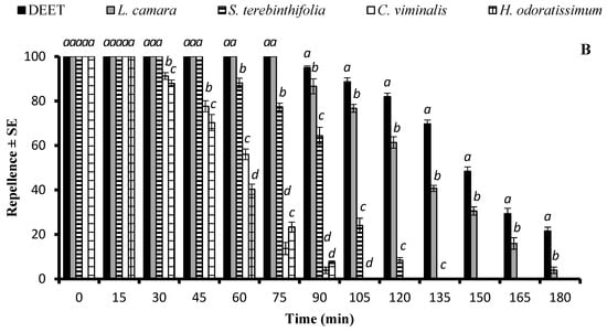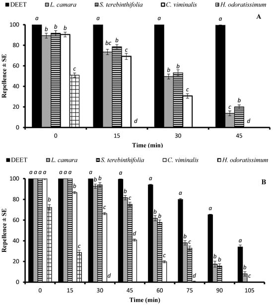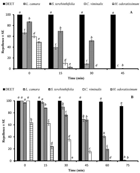 Repellent longevity of DEET and four EOs against Aedes aegypti females at the tested doses of 33.3 µg/cm2 (A) and 333 µg/cm2 (B). Different letters on bars indicate significant differences (p < 0.05) between the repellency of different substances tested after specified time intervals independently, according to the ANOVA post-hoc Tukey test. “SE” stands for standard error (n = 5).