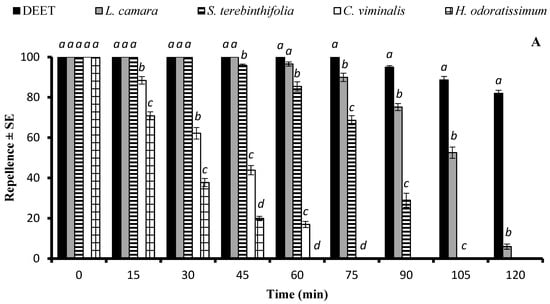 In the screening bioassay with a 1% w/v solution (33.3 µg/cm2 tested dose), the EOs of L. camara, S. terebinthifolia, C. viminalis, and H. odoratissimum showed more than 50% repellency against all mosquito species and were further investigated to determine the maximum period of repellent activity.