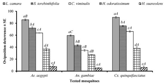 The EOs distilled from L. camara and S. terebinthifolia leaves displayed prolonged repellent activity, as well as greater oviposition deterrent activities against adult females of Ae. aegypti, An. gambiae, and Cx. quinquefasciatus. Cx. quinquefasciatus was found to be the most susceptible to repellency, as compared to Ae. aegypti and An. gambiae. In conclusion, the L. camara and S. terebinthifolia EOs have the potential to be natural mosquito repellents.