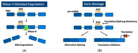 Mechanism of action of ASOs through either RNase H-mediated degradation (a) or steric blockage (b). (a) ASOs bind to target RNA, and the RNA-ASO complex is recognized by RNase H, which subsequently degrades the target RNA. (b) ASOs bind to target RNA and, based on the region targeted, block translation or splicing machinery. Blocking splicing machinery results in alternative splicing of the pre-mRNA transcript. Blocking translation machinery prevents translation of the target RNA.