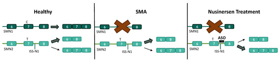 Nusinersen mechanism of action for the treatment of SMA. In healthy cells, SMN1 is processed primarily into full-length SMN mRNA, containing exon 7. Exon 7 is predominantly skipped in SMN2 pre-mRNA processing, resulting in a dysfunctional SMN protein. In SMA, no functional SMN protein is translated from SMN1. Nusinersen, an ASO targeting the ISS-N1 element, promotes the inclusion of exon 7 in SMN2 pre-mRNA processing to increase full-length SMN proteins.