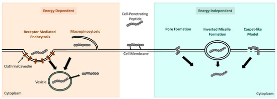 Despite the recent rigorous study of CPPs as delivery systems for small cargo/drugs, the mechanisms that allow CPPs to transverse across biological membranes are not clearly understood. CPPs and their cargo are believed to be internalized into cells through either energy-dependent endocytosis pathways or energy-independent direct-translocation pathways (Figure 3). The physicochemical properties appear to have a major effect on which pathway mediates CPP–cargo internalization; however, the experimental design, including drug concentration, cell type, and length of incubation, can also have an influence [108]. The internalization of low doses of cationic CPPs are observed to be primarily mediated by energy-independent pathways, whereas the cellular uptake of amphipathic CPPs at low doses is mediated by energy-independent pathways [86]. However, delivery of cationic CPPs through cell membranes can become mediated by direct translocation when high doses of these CPPs are used.