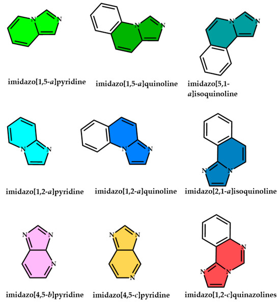 Moreover, imidazoquinolines correspond to various structures (such as imidazo[5,1-a]quinolines and imidazo[2,1-a]isoquinolines) in which a third aromatic ring connects to the imidazopyridine nucleus. These derivatives represent the extension of the aromatic system of the classic imidazopyridines; the extended delocalized system alters their optical, structural, and solubility properties, sometimes presenting a promising structural alternative to the common heterocyclic ring such as phenanthroline, carbazole, benzoquinoline, acridine, and many others [,,,,,,,,,,].