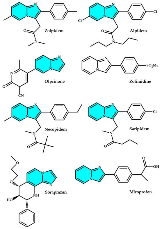 Main imidazo[1,2-a]pyridine-based drugs (the imidazo[1,2-a]pyridine core is represented here in blue).