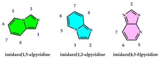 According to current nomenclature, imidazopyridines are generally categorized into various groups based on the position of the nitrogen atoms and the distinct connections between the imidazole and pyridine rings (refer to Figure 1). Despite potential variations in composition or nitrogen atom count across individual structures (e.g., imidazo[1,2-a]pyridine and imidazo[4,5-c]pyridine), they all fall under the classification of imidazopyridines [,,,]. Each imidazopyridine nucleus differs in its peculiar biological, physical, and chemical properties, and these diverse behaviors imply various fields of application [,,].