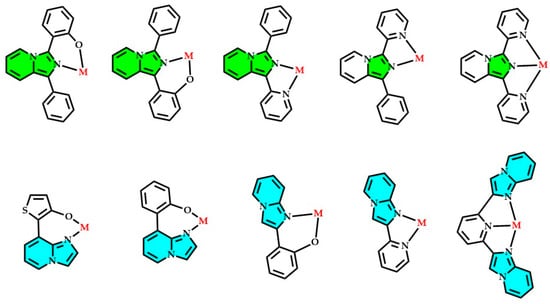In a different scenario, the imidazo[1,5-a]pyridinic nucleus can be employed as an N-O ligand if an appropriate substituent is previously introduced at position 1 on the imidazo[1,5-a]pyridinic unit (see Figure 5); this type of ligand has been coordinated to Ni, Co, and Pd, with the purpose to prepare emissive products for optoelectronic devices [,,].