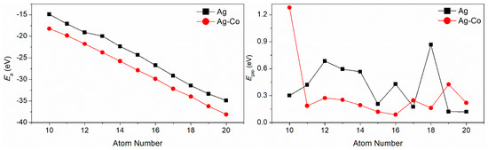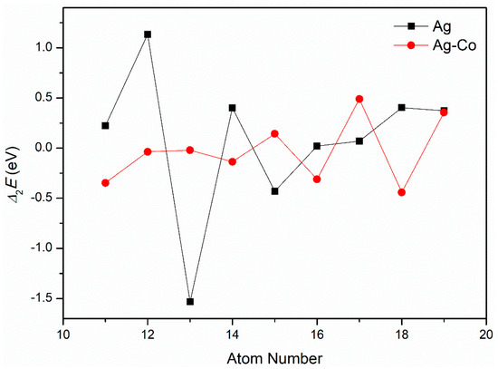 The second-order differential energy values of pure Ag and Ag–Co clusters are given in Figure 3. For pure silver clusters, the values of the Ag12, Ag14, and Ag18 clusters are larger than those of their neighboring clusters, respectively; therefore, the Ag12, Ag14, and Ag18 clusters are relatively stable. For the Ag–Co clusters, the values of the Ag12Co1, Ag14Co1, and Ag16Co1 clusters are larger than those of their neighboring clusters, respectively; therefore, the stability of these clusters is relatively high.
