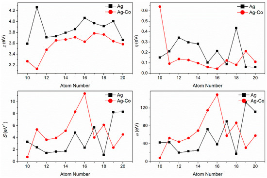The χ, S, η, and ω of the pure Ag and Ag–Co clusters are shown in Figure 4. For pure Ag clusters, the electronegativity χ value increases with the number of atoms. The χ value of the Ag11 cluster is the highest, and the χ value of the Ag10 cluster is the lowest. These results indicate that the ability of the Ag11 cluster to obtain electrons is the strongest, and that of the Ag10 cluster is the weakest, the remaining clusters being in between the two. Comparing the χ values of pure silver clusters, we see that the χ value of the Ag–Co cluster decreases. For Ag–Co clusters, when the quantity of atoms reaches 10–13, the χ values firstly decrease and then increase; when the number of atoms is greater than 13, the χ values change very little, keeping around 3.7 eV. The χ value of the Ag10Co1 cluster is the lowest, and the χ value of the Ag16Co1 cluster is the highest. These results show that the ability of Ag–Co clusters to obtain electrons is reduced; that of the Ag16Co1 cluster is the strongest and that of the Ag10Co1 cluster is the weakest, and as the quantity of atoms increases, the ability of the Ag–Co clusters to obtain electrons firstly weakens, then increases, and then tends towards no change.
