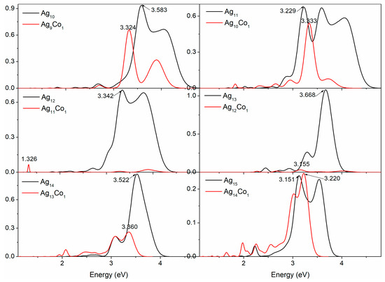In the field of materials science, the spectral analysis of metal clusters is a crucial research approach. Through further study, we obtained spectra for the 10–15-atom Ag–Co clusters (Figure 5) and analyzed them in detail. These spectra present a sequence of distinct absorption peaks, and the appearance of these peaks indicates excited electrons in these clusters, revealing for us the electronic-level structure of the clusters. The spectrum of the Ag10 cluster presents three significant absorption peaks, of which the peak at 4.052 eV is close to the experimental peak at 3.98 eV [44] or 3.97 eV [49], and the strongest peak is located at 3.583 eV. When a Co atom is doped into the Ag10 cluster forming the Ag9Co1 cluster, the spectrum of the Ag9Co1 cluster also shows three distinct absorption peaks, and the strongest peak of this cluster is located at 3.324 eV. Consequently, a spectral redshift is observed in the Ag9Co1 cluster in comparison to the Ag10 cluster. The spectrum of the Ag11 cluster shows three significantly strong absorption peaks and three small peaks, which can be seen in the experimental spectrum of the Ag11 cluster [44,50,51]; the strongest peak is located at 3.229 eV. The spectrum of the Ag10Co1 cluster also displays one strong peak and five small peaks, and the strongest peak of this cluster is located at 3.333 eV. The spectrum of the Ag10Co1 cluster exhibits a blueshift of 0.104 eV in comparison to that of the Ag11 cluster. There are two strong peaks and two small peaks in the spectrum of the Ag12 cluster, which are in agreement with the experimental peaks [44]; the strongest peak is located at 3.342 eV. When the Co atom is in the Ag12 cluster, the absorption peaks become too weak; there are three small absorption peaks, and the strongest peak is located at 1.326 eV. Compared with the spectrum of the Ag12 cluster, a big redshift in the spectrum of the Ag11Co1 cluster is observed. There is one strong peak and four small peaks in the spectrum of the truncated octahedral Ag13 cluster, which findings are in agreement with experimental peaks [44] and our previous findings [46], wherein the strongest peak lies at 3.668 eV. While the peaks of the optical spectrum of the icosahedral Ag12Co1 cluster become very weak, the strongest peak lies at 3.155 eV. A redshift in the spectrum of the Ag12Co1 cluster is observed compared with the Ag13 cluster. There is one strong peak and three small peaks in the spectrum of the Ag14 cluster; the strongest peak lies at 3.522 eV, which is close to the experimental peak at 3.48 eV [44]. With a Co atom doped in the Ag14 cluster, the spectrum of the Ag13Co1 cluster has more peaks than that of the Ag14 cluster and shows six peaks, the strongest peak lying at 3.360 eV. The spectrum of the Ag13Co1 cluster exhibits a redshift of 0.162 eV in comparison to that of the Ag14 cluster. There are two strong peaks and one small peak in the spectrum of the Ag15 cluster, the strongest peak lying at 3.131 eV, and a peak at 3.532 eV is observed in the experimental spectrum [44]. At the same time, with a Co atom doped in the Ag15 cluster, the spectrum of the Ag14Co1 cluster has more peaks than that of the Ag15 cluster, and shows two strong peaks and five small peaks, the strongest peak lying at 3.220 eV. There is a 0.089 eV blueshift observed in the spectrum of the Ag14Co1 cluster in comparison to the Ag15 cluster.