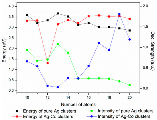 Generally speaking, the spectral analysis of the Ag–Co clusters has provided valuable insights into their electronic structure and the influence of introducing Co into these clusters on their optical properties. Figure 7 displays the energy and intensity of the optical peaks of the Ag–Co clusters with increasing numbers of atoms. For the pure Ag clusters, the energy and intensity of their spectra generally change little as the number of atoms increases, i.e., redshift occurs as the number of atoms grows. For the Ag–Co clusters, the energy of their spectra overall exhibits little change as the number of atoms grows; the strongest peaks are roughly distributed at 3.5 eV, and the intensity of their spectra strengthens overall. When the numbers of atoms are 10, 12, 13, and 14, the addition of the Co atom makes the optical spectra redshift and weakens the intensity. As the number of atoms is 15–20, doping with Co leads to a redshift of the optical spectra and a strengthening of intensity. The blueshift or redshift in the absorption peaks with the addition of a Co atom suggests that the Co atom has the ability to adjust the electronic characteristics of the Ag–Co clusters efficiently. These findings have important implications for the development of novel optical materials and the understanding of the fundamental processes governing the electronic properties of metal clusters.