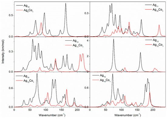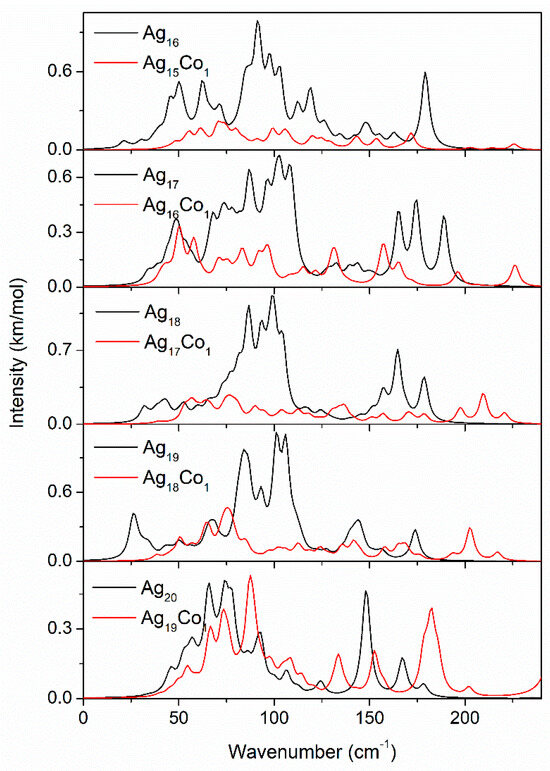 The vibrational spectra of the 16–20-atom Ag–Co clusters are displayed in Figure 11. Both the vibrational spectra of the Ag16 and Ag15Co1 clusters are more complex, and the intensity of the vibrational peaks of the Ag16 cluster is stronger than that of the Ag15Co1 cluster. A new vibrational peak at 225.7 cm−1 is observed in the Ag15Co1 cluster. The vibrational spectra of the Ag17 and Ag16Co1 clusters are similar to those of the Ag16 and Ag15Co1 clusters; they are more complex, and a new vibrational peak at 225.8 cm−1 is observed in the Ag16Co1 cluster. The vibrational spectra of the 18-, 19- and 20-atom Ag and Ag–Co clusters are also similar to those of the Ag16 and Ag15Co1 clusters, and they are also more complex; however, the vibrational spectra of the 18-, 19-, and 20-atom Ag–Co clusters exhibit some new vibrational peaks above 200 cm−1. These findings can serve as a basis for further investigations into the Ag–Co clusters and their potential applications in various fields. Moreover, the vibrational spectra presented here can serve as a reference for the characterization of other Ag–Co clusters and related systems, contributing to a deeper understanding of their structural and dynamic properties.