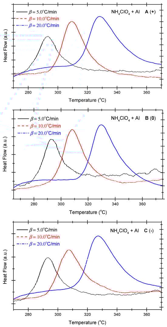 DSC curves of ammonium perchlorate-aluminium system ((A) (+): positive oxygen; (B) (0): zero oxygen; (C) (−): negative oxygen). (Note: The black, red, and blue dotted lines in the above figure correspond to heating rates of 5 °C/min, 10 °C/min and 20 °C/min, respectively).